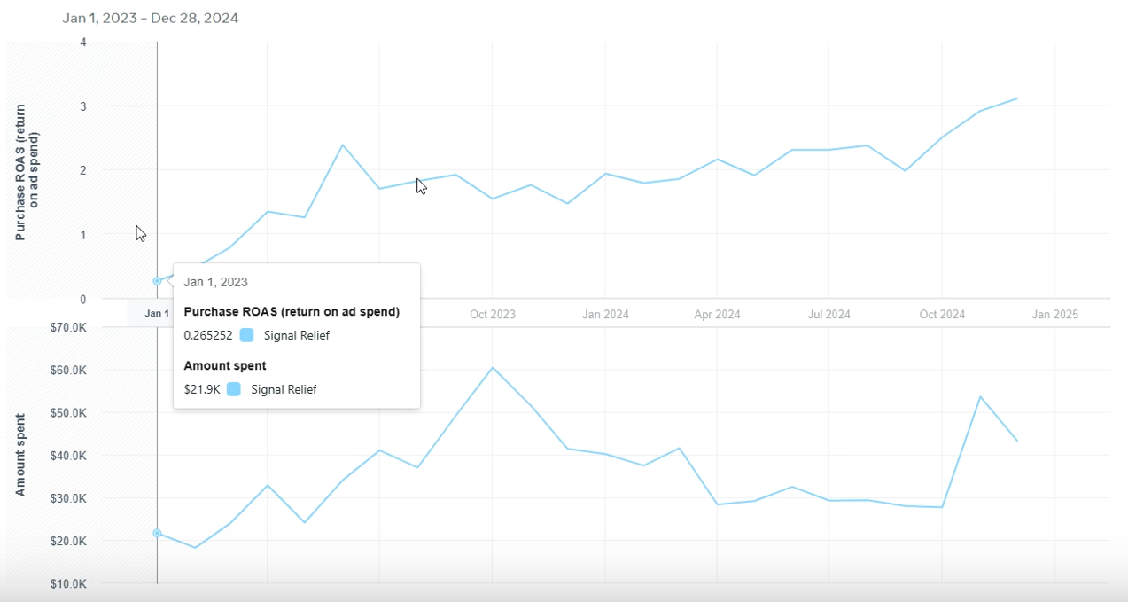 When Signal Relief approached me, their advertising strategy was in need of a complete overhaul. Their previous approach to Meta advertising relied on a passive “set it and forget it” model, which led to inefficiencies and inconsistent results. For example, in early 2023, their campaigns generated a return on ad spend (ROAS) as low as 0.26, resulting in significant losses.